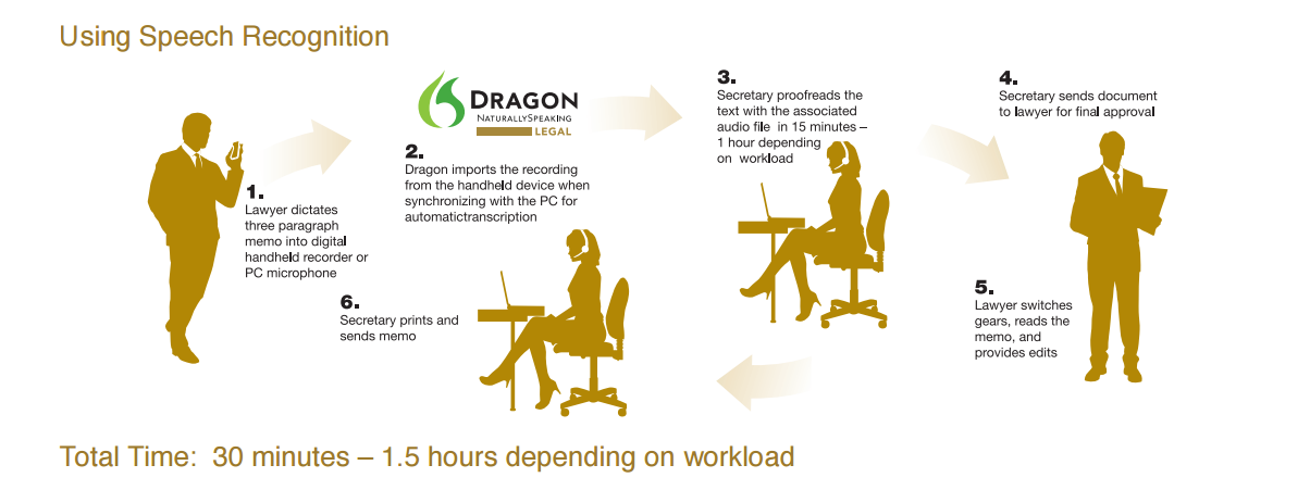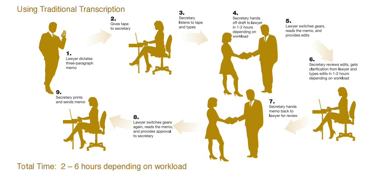 Third-party Transcription: A lawyer dictates into a telephone or digital recorder, and the audio is sent to an outside transcriptionist; alternatively, the recording may be sent to an in-house transcriptionist, secretary or legal assistant. Outsourced transcription is simply too expensive and time consuming, slowing down proceedings, impacting client satisfaction, and cutting into profits. Although in-house transcription may be more cost-efficient than outsourced efforts, there is still a lengthy and unproductive back-and-forth of review cycles with support staff.